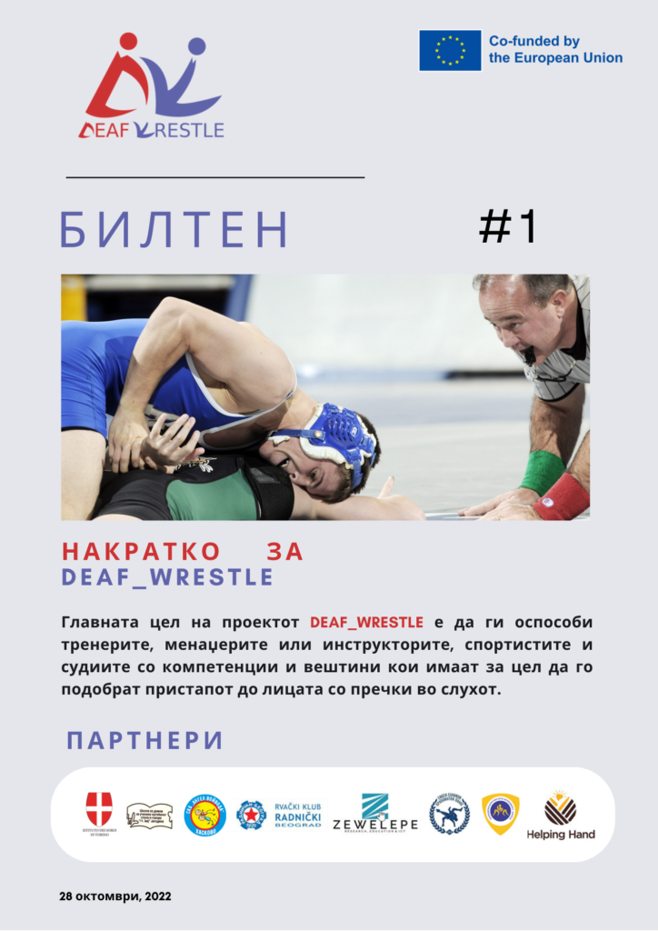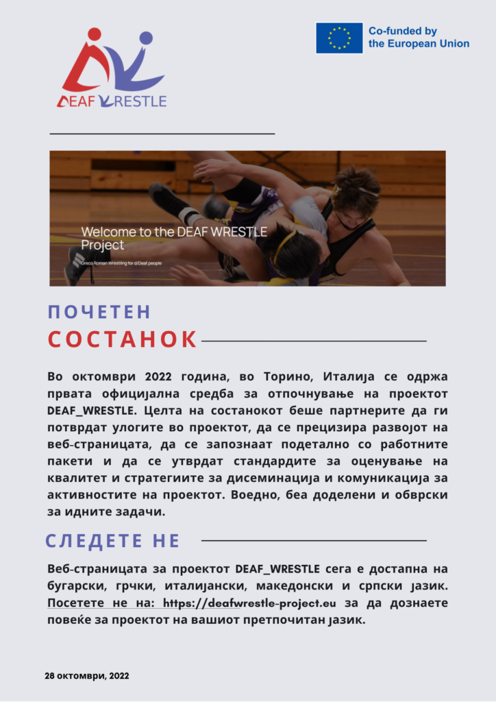 Во октомври 2022 година, во Торино, Италија се одржа првата официјална средба на партнерите за отпочнување на проектот „Грчко-римско борење за глуви лица“. Целта на оваа средба беше се потврдат улогите во проектот, размена на позитивни практики и искуства и подетално утврдување на работните активности во рамки на проектот.